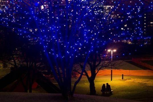 Una pareja se sienta bajo las luces en un parque en el centro de Tokio, Japón.