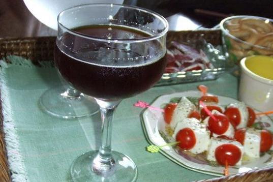 Los ingredientes son cava, Frangelico, crema de grosella negra, lima y guindas. Mira aquí la receta.