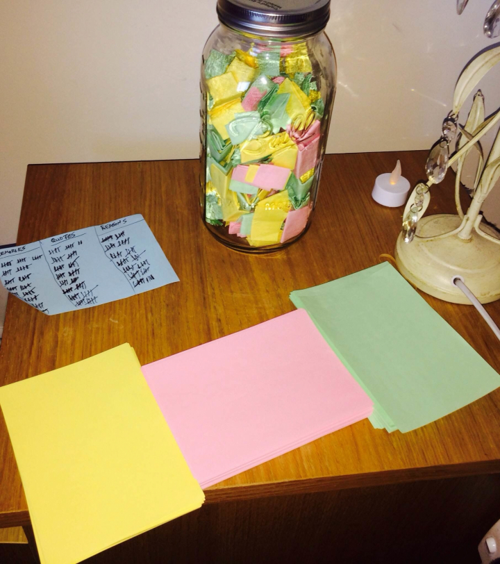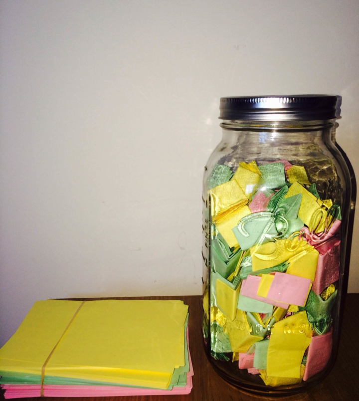 "Mi pequeño puesto de trabajo después de llevar 230 papelitos escritos y doblados. En este punto, la muñeca empezaba a resentirse de escribir, pero el tarro empezaba a coger forma. Me gusta especialmente cómo quedaban los colores. ¡Sólo quedan 135!", escribió en su cuenta de Imgur.
