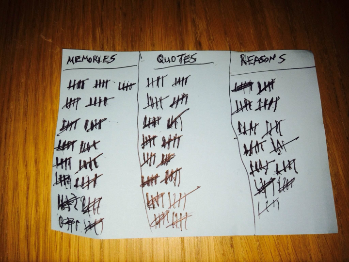 Creó distintas categorías y las organizó según un código de colores: Momentos y colores para los papelitos amarillos, Citas y letras de canciones en los verdes y Razones por las que te quiero en color rosa.