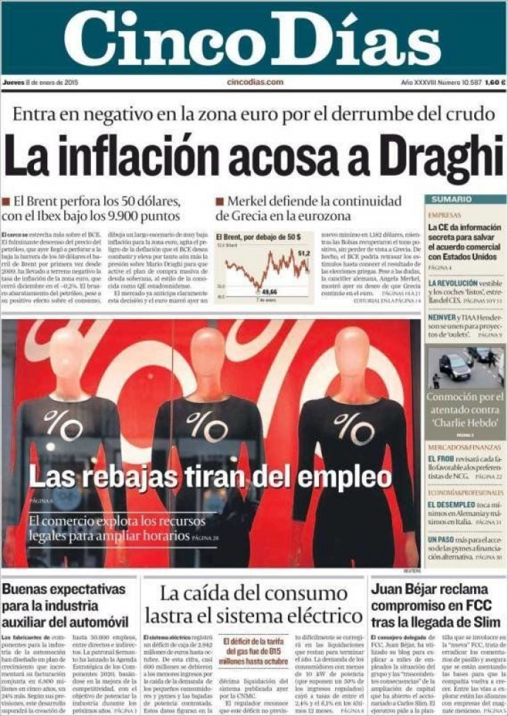 "La inflación acosa a Draghi", titula en primera Cinco Días en la línea de un Wall Street Journal que señala que "la inflación negativa -nuevo eufemismo para no hablar de deflación- dificulta el trabajo del BCE". La Vanguardia considera en un editorial que la institución de Fráncfort ha fracasado al no evitar los bajos precios. "La deflación -nos recuerda El Mundo en un editorial- es nefasta para cualquier país porque, cuando los agentes económicos esperan que los bienes en el futuro sean más baratos que en el presente, se paralizan las decisiones de consumo e inversión". Además, es preocupante "porque indica que la actividad no se acelera. La Unión Europea necesita crecer para apuntalar la recuperación y la evolución de la inflación señala que no lo está haciendo de forma consistente". Precisamente, Financial Times señala por su parte que "el flojo crecimiento debería preocupar más a los