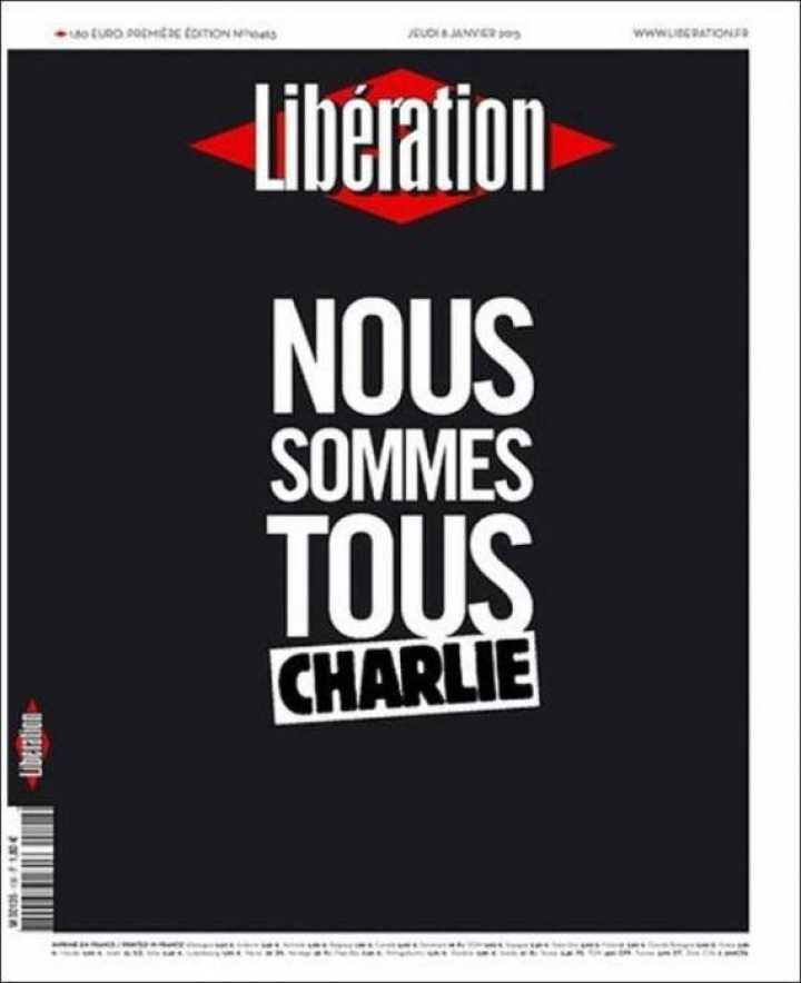 principales ciudades de Francia, en las que periodistas y ciudadanos levantan un bolígrafo, un lápiz o un carnet de prensa como muestra de solidaridad con Charlie Hebdo y los dibujantes asesinados. "Todos somos Charlie", proclama en primera sobre fondo negro Libération, el diario hermano del semanario satírico. En el editorial, su director Laurent Joffrin señala que "los terroristas no han atacado a los islamófobos, a los enemigos de los musulmanes... sino a Charlie, la tolerancia, el rechazo del fanatismo..."