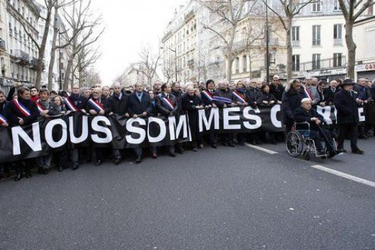 La Marcha Republicana, encabezada por los supervivientes y familiares de las víctimas, seguidas de líderes internacionales y de todas las religiones tras el presidente francés, François Hollande, enarbolando una pancarta "Je Suis Charlie", ha avanzado por las calles de la capital en una atmósfera de concordia, pero bajo la vigilancia de más de 2.200 agentes de Policía fuertemente armados. "París es hoy la capital del mundo", dijo Hollande.