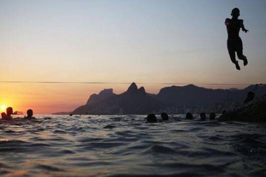 Un joven salta desde el acantilado durante la puesta de sol en Arpoador, Río de Janeiro (Brasil).