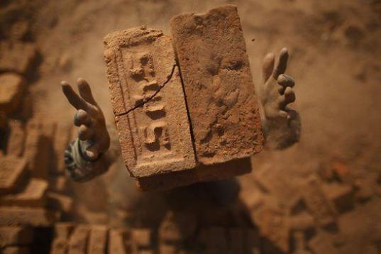 Un trabajador apila ladrillos sobre su cabeza en una fábrica en Lalitpur (India).