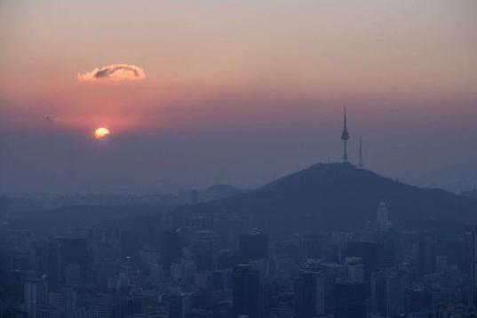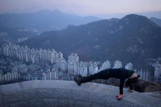 Una deportista hace estiramientos al amanecer, con una vista panorámica de la ciudad de Seúl de fondo.