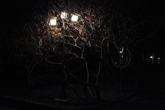 Las farolas se encienden entre un árbol cerca del lago de Issyk-Kul en Kirguistán.