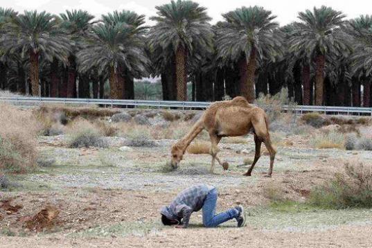 Un beduino reza junto a su camello en el desierto de Judea, entre Jericó y Jerusalén.