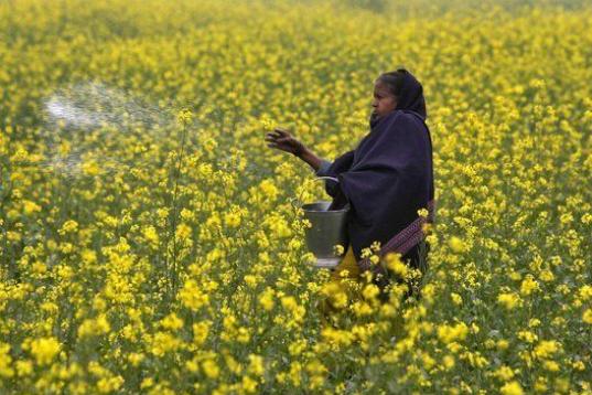 Una agricultora esparce urea en su campo de mostaza en Allahabad (India).