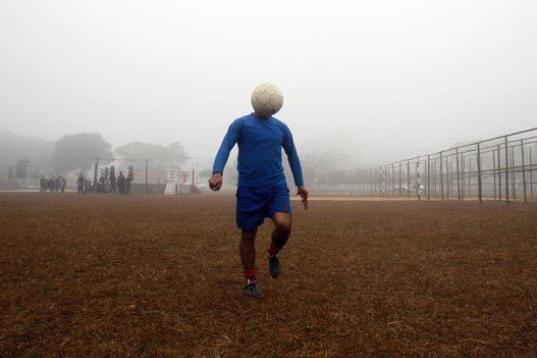 Un jugador controla la pelota en un entrenamiento de fútbol en Agartala (India).