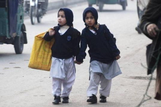 Dos niñas se dirigen a su escuela en Peshawar (Paquistán). Tras la masacre de 134 estudiantes el pasado 16 de diciembre, su colegio acaba de reabrir sus puertas.