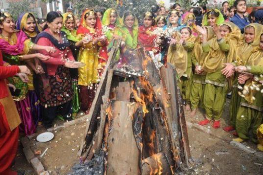Un buen número de estudiantes ataviadas con coloridos trajes se reúne en torno a un fuego durante la celebración del festival Lohri en India. Esta fiesta marca la culminación del invierno.