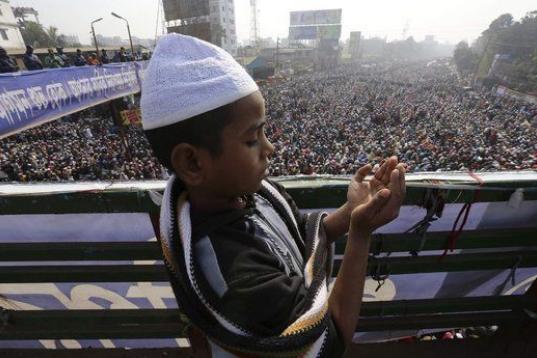 Un niño reza sobre un puente en las oraciones finales de la primera fase del Bishwa Ijtema en Dhaka (Bangladés). El Bishwa Ijtema es una de las mayores congregaciones de musulmanes después de la peregrinación a La Meca.