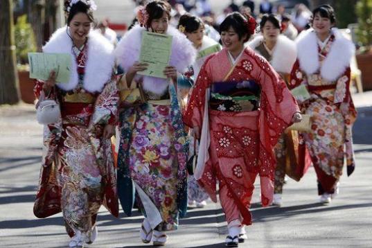 Varias japonesas con kimonos celebran su mayoría de edad en un parque temático. A esta ceremonia son convocados los jóvenes que cumplen los 20 años entre el 2 de abril del año anterior y el 1 de abril del año presente. Según el comunicado...