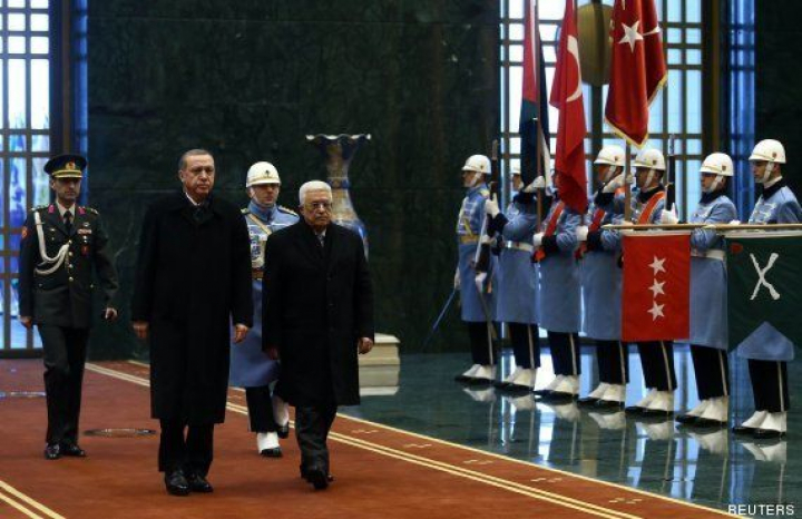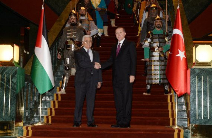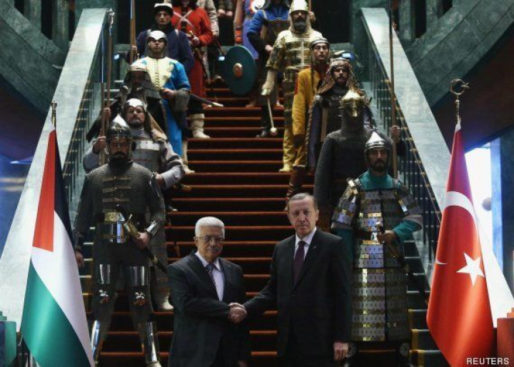 La llegada este lunes del presidente palestino, Mahmud Abás, al palacio presidencial de Ankara, donde fue recibido por su homólogo turco y anfitrión, Recep Tayyip Erdogan, estuvo marcada por la presencia de una guardia de honor nunca vista, con cotas de malla, yelmos y sables.