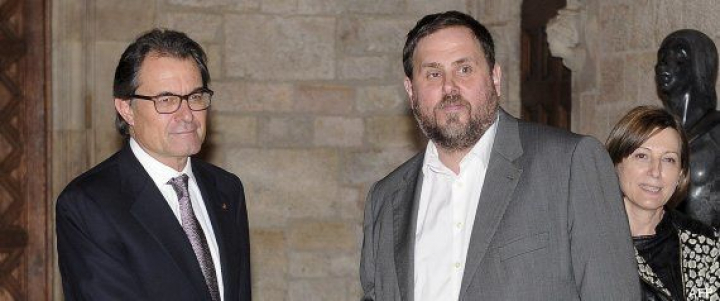 Mas ha comparecido en el Palau de la Generalitat tras la reunión que ha mantenido con el líder de ERC, Oriol Junqueras, y los presidentes de la ANC, Carme Forcadell; Òmnium Cultural, Muriel Casals, y de la Associació de Municipis per a la Independència (AMI), Josep Maria Vila d'Abadal.