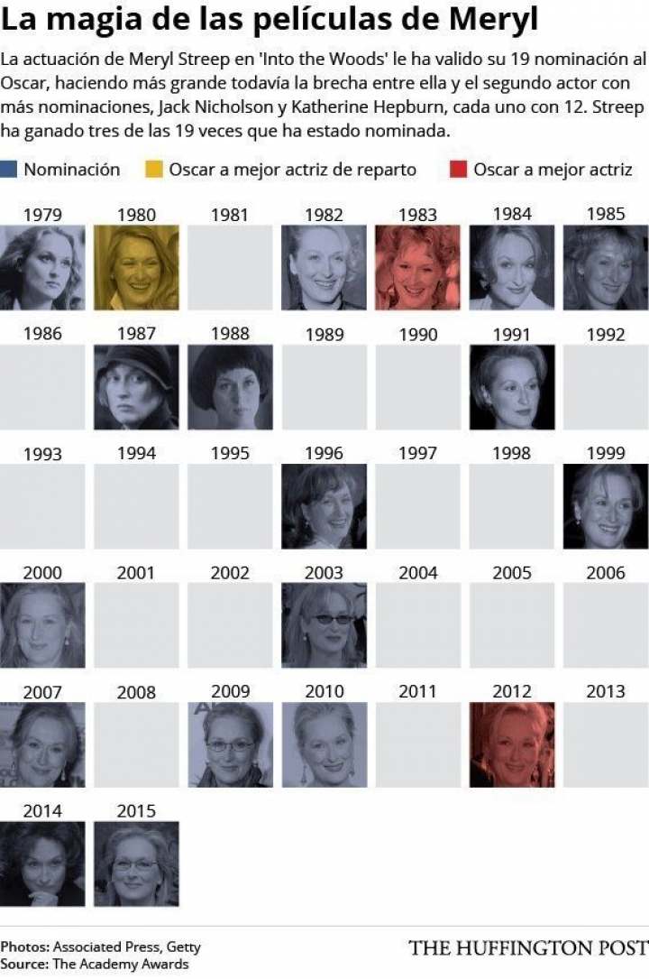 Es algo que llevas escuchando durante años, y que por ahora no tiene trazas de cambiar: Meryl Streep tiene más nominaciones que cualquier otro actor o actriz de la historia de los Oscar. Streep despertó el jueves 15 con la noticia de que había logrado su 19º reconocimiento por parte de la Academia, esta vez por Into the Woods. Eso significa que sigue muy por encima de Jack Nicholson y Katharine Hepburn, que con 12 nominaciones cada uno se sitúan como los segundos actores más nominados de la historia.