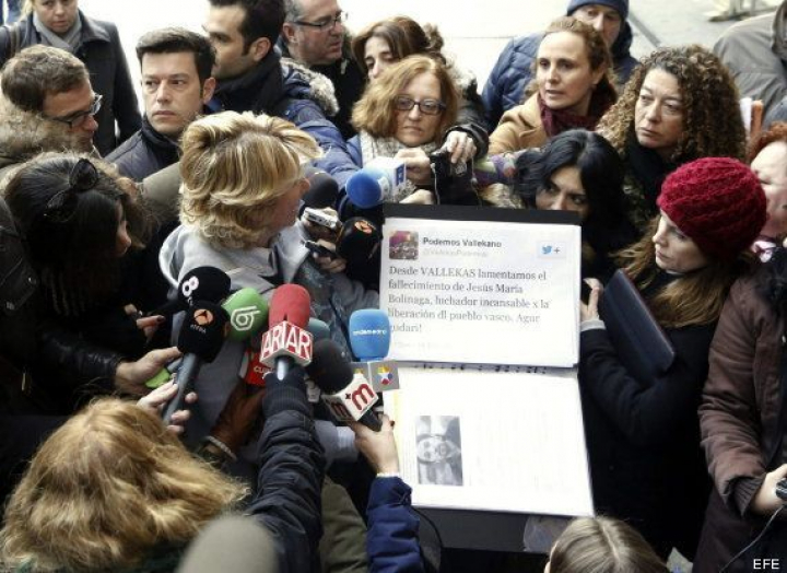 Esperanza Aguirre ha acudido al acto de conciliación con Podemos con una enorme carpeta negra en la que llevaba diversos documentos gráficos, entre ellos, un tuit de la cuenta @VallekasPodemos en el que se ensalza la figura de Bolinaga, el etarra fallecido la semana pasada.