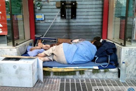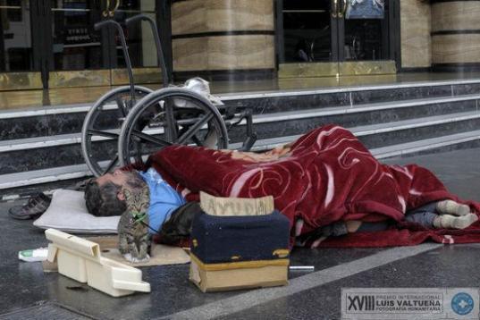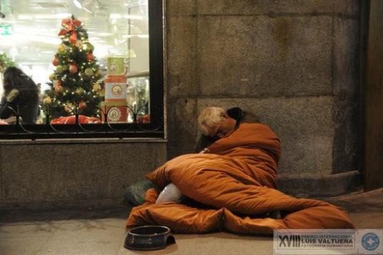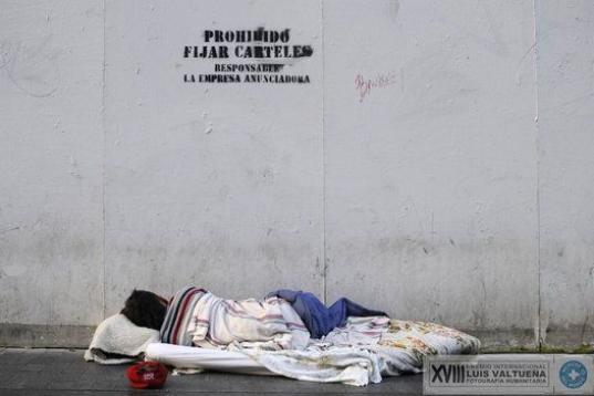 Efrén González, de 68 años, tapa a su nieta, que duerme en la calle tras haber sido desahuciados en Madrid en septiembre de 2013. Efrén Rodríguez González y los seis miembros de su familia vivieron en un piso de la EMVS (Empresa Municipal ...