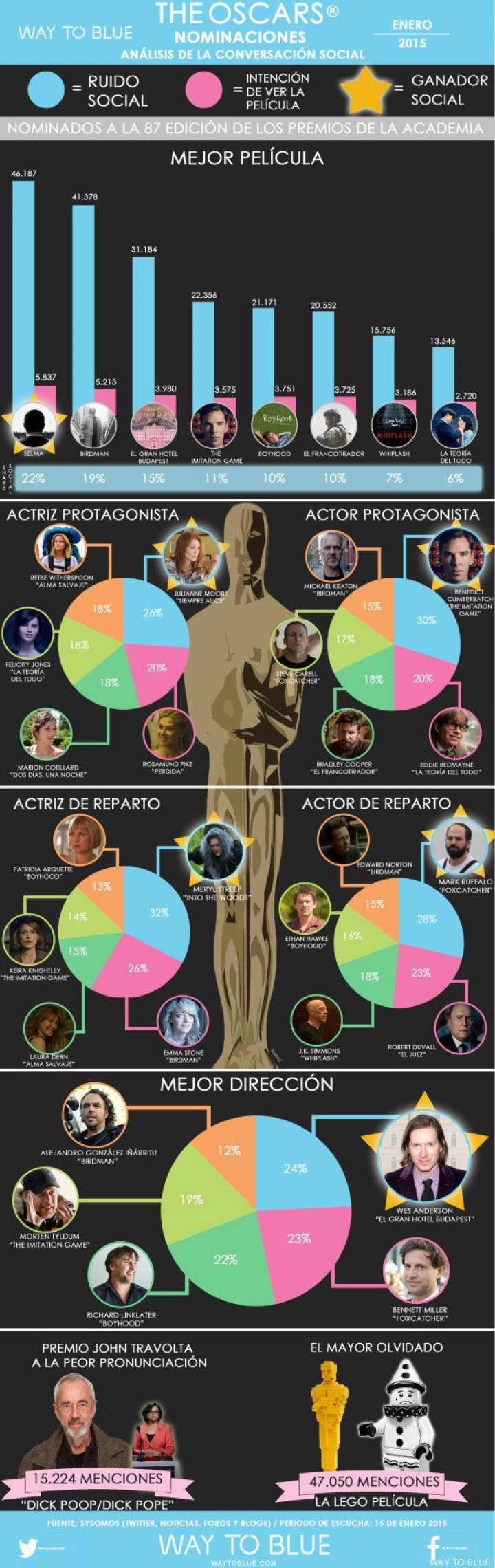 Sin embargo, son miles los usuarios de Twitter que ya han hablado de las películas, de sus protagonistas y de sus directores. Y, por supuesto, muchos ya han juzgado quiénes deberían llevarse el Oscar, o quién es el mejor actor. Y con todas esas opiniones la agencia de comunicación Way To Blue ha realizado una infografía, analizando la conversación que se ha generado en las redes sociales.