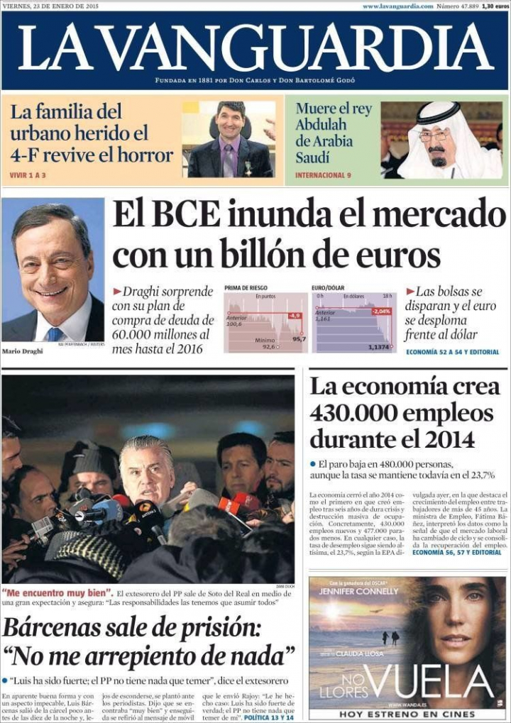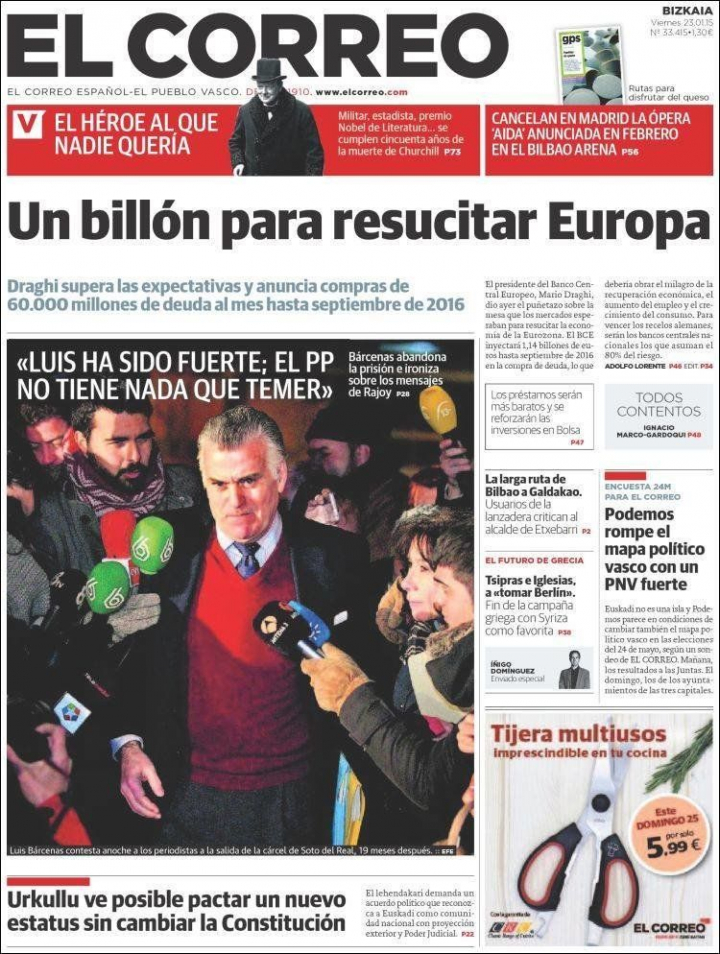 "Un billón para resucitar Europa", resume en primera El Correo, mientras Cinco Días recurre a los términos guerreros para titular: "Bazucazo de un billón". "Un plan más agresivo de lo que los mercados esperaban", valora el Wall Street Journal, mientras que Financial Times, en su editorial, parece respirar al asegurar que el BCE abre por fin la espita monetaria, aunque estima que "superar la deflación en la Eurozona requerirá un tratamiento sostenido".
