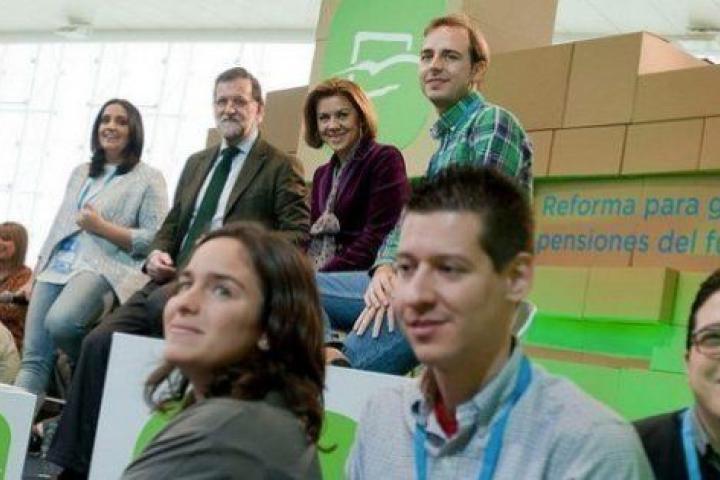 El ministro de Sanidad, Alfonso Alonso, y el director de la Oficina Económica del Presidente, Álvaro Nadal, sentados en el suelo escuchando a la vicepresidenta, Soraya Sáenz de Santamaría. El presidente del Gobierno, Mariano Rajoy, rodeado de Nuevas Generaciones en la Plaza de la Juventud. Alcaldes proclamando que son de la “casta de los electricistas, de las administrativas y de los electricistas”. El PP ha hecho este sábado su primer gran ensayo electoral… a lo Podemos y contra Podemos.