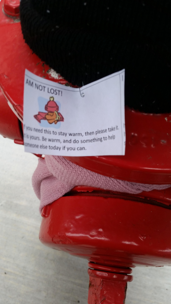 En los últimos días han aparecido gorros y bufandas en varias ciudades que este invierno están sufriendo temperaturas muy bajas. La ropa -que se ha visto en ciudades como Edmonton y Winnipeg en Canadá y en Wilmington, Estados Unidos- viene con mensajes que instan a los necesitados a cogerla.