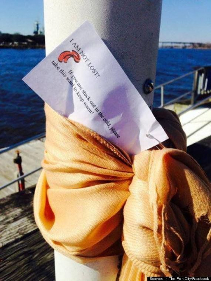 El grupo responsable de ese cartel en particular, llamado Scarves in the Port City, dice que su objetivo es ofrecer una mano amiga de una forma sencilla y eficaz a todos aquellos que lo necesitan durante el invierno.