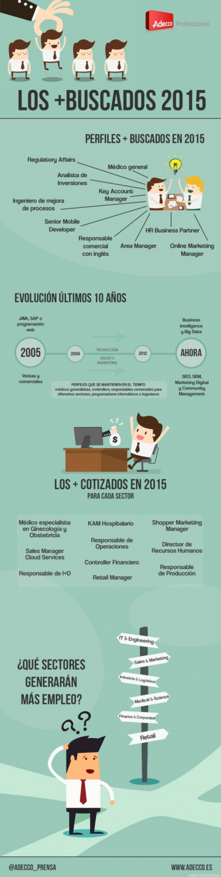 El informe refleja cómo ha evolucionado el mercado laboral español. Echando la vista atrás se aprecia que hay perfiles que nunca se dejan de necesitar: médicos generalistas, controllers, responsables comerciales para diferentes sectores, programadores o ingenieros. En áreas concretas en constante evolución como la informática, el perfil demandado ha cambiado mucho: los programadores JAVA y SAP han dado paso a expertos en business intelligence y big data, analistas de grandes cantidades de información. Cada vez se buscan más perfiles transversales y versátiles, capaces de adaptarse a nuevas situaciones. Han adquirido importancia los aspectos soft de los candidatos, vinculados a las actitudes.