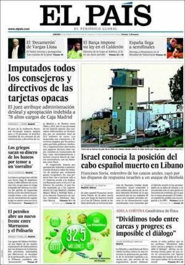 La frase pronunciada por Jordi Pujol ante el juez resume la estrategia del expresident sobre el dinero que su familia tenía en Andorra y al leerla a toda página en La Vanguardia provoca una sensación de estupor en el lector que no disminuye al leer en El Mundo que el consejero de Caja Madrid Pérez Claver pidió al director financiero que los 21.800 "del exceso del coche" de lujo que había adquirido fuera descontado del límite de la tarjeta opaca. Unas tarjetas en B por las que han sido "imputados todos los consejeros y directivos" de la entidad financiera, como destaca El País. "El lenguaje de la corrupción" es objeto de un extenso artículo de Elisa de la Nuez, en el que denuncia el "uso que la clase política hace del lenguaje para desmarcarse de los casos de corrupción". En El Mundo, la abogada del Estado cree que se debe exigir que "nos hablen con propiedad y sin tergiversaciones, no vaya a ser que la conversación política acabe degenerando en una conversación de mafiosos".