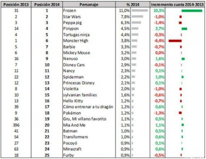 En Amazon España también han notado el fenómeno Frozen ests fiestas. En este periodo, la venta de productos relacionados con Elsa y Anna aumentó un 10,2%. "Un año después de su estreno en salas, la popularidad de esta película ha llegado a los juguetes", explica Xavier Garambois, vicepresidente de retail en Amazon Europa. Más de mil productos de todo tipo sobre la película lo atestiguan. Esta compañía elabora anualmente un Índice de popularidad de personajes infantiles y las dos princesas han sido las ganadoras indiscutibles de la Navidad 2014, con una subida de 31 posiciones de golpe, desbancando a otros superventas como Peppa Pig, las Tortugas Ninja o Barbie. En este cuadro puedes verlo de manera más detallada.