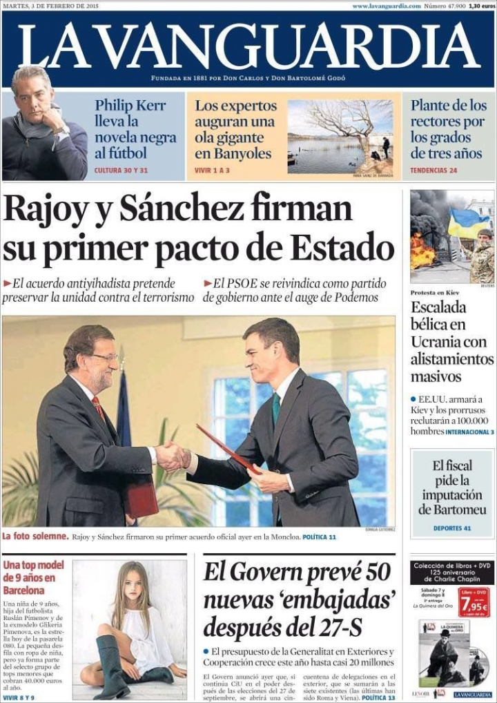 Dos manos que se estrechan, dos hombres vestidos de oscuro que se miran a los ojos y exhiben una discreta sonrisa de satisfacción. Una foto a la que El País pone el siguiente titular: "PP y PSOE logran el primer pacto de Estado contra el yihadismo" y en su editorial concluye que se trata de un acuerdo "en defensa de la libertad" y "un paso importante para tratar de neutralizar una amenaza que se cierne sobre las sociedades democráticas". En este sentido, minimiza las críticas que merece la adopción de reformas penales coyunturales como "la prisión permanente revisable". El Mundo también se apunta con entusiasmo al acuerdo que considera como "necesario" y al que invita a sumarse al resto de fuerzas políticas, "que, a su juicio, deberían eludir la tentación de dejarse llevar por intereses particulares en un año eminentemente electoral". La "foto solemne" como la titula La Vanguardia, pone, a juicio de su director, "un contrapunto de confianza en el sistema, en un momento en que muchos parecen dispuestos a cambiarlo todo de arriba a abajo".