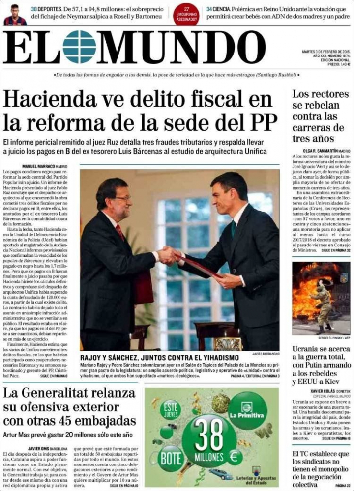 "Hacienda ve delito fiscal en la reforma de la sede del PP", asegura El Mundo a toda página en virtud del informe pericial remitido al juez Ruz y que detalla tres fraudes tributarios cometidos por los socios del despacho de arquitectos en colaboración con Bárcenas y su entonces subordinado, Cristóbal Páez. La cifra defraudada supera los 120.000 euros , a partir de la cual existe delito. Comparado con esto, suena a chiste la información de ABC que apunta a Íñigo Errejón: "Expertos laboralistas ven indicios de fraude a la Seguridad Social en Podemos, porque difícilmente el número dos de un partido puede ser un profesional autónomo".