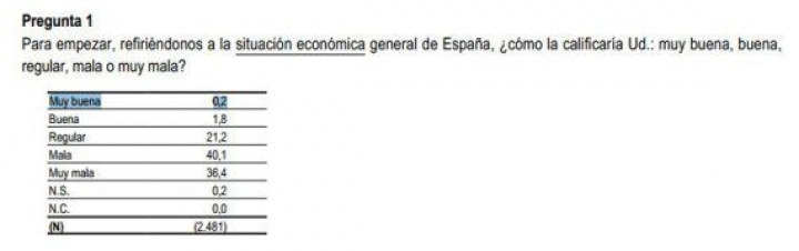 El 0,2 de los participantes en el barómetro del CIS ni sienten ni padecen la crisis. Para ellos la situación económica general de España es "muy buena" frente al 36,4 que cree que es "muy mala" y el 40,1% que la consideran "mala".