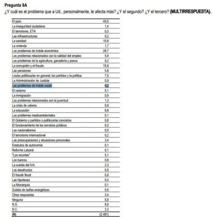 Los problemas de índole social son citados como una de las principales preocupaciones por el 6,2% de los encuestados, por delante de la preocupaciones y situaciones personales que afectan más al 3,4% de los consultados por el CIS.