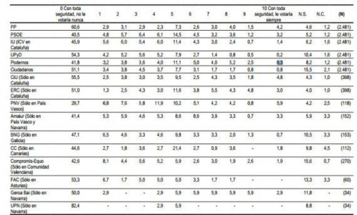 Podemos es el partido que cosecha más porcentaje de encuestados que les votarían "siempre", un 6% declara que votará "con toda seguridad" al partido de Pablo Iglesias cada vez que tengan que ir a las urnas.