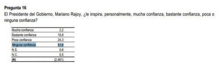 Un amplio porcentaje de la muestra, el 61,6%, dice no tener "ninguna confianza" en el presidente del Gobierno. En frente, solo el 2,2% declara que Rajoy le inspira "mucha" confianza". Algo más fiable resulta en las encuestas el líder de la oposición, Pedro Sánchez, que no inspira "ninguna confianza" al 35% de los encuestados.