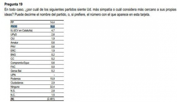 El 16,6% lo eligen como el partido por el que siente más simpatía o más cercano a sus ideas, frente al 15,9% que eligen a Podemos y el 14,4 que ven a los 'populares' como los más simpaticones.