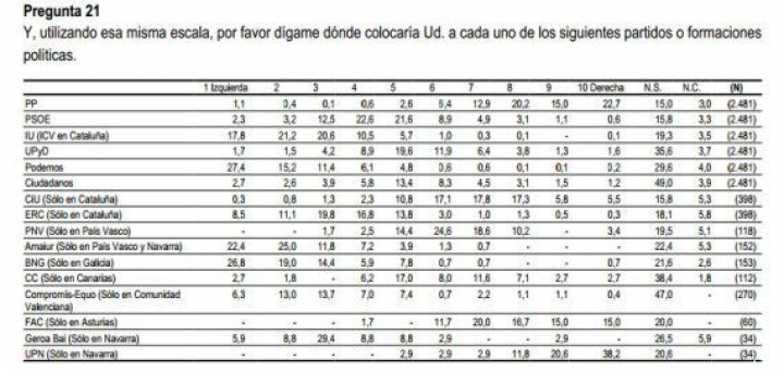 Algunos andan un poquillo despistados a la hora de situar la ideología de partido. ¡27 de los encuestados han colocado al PP en la extrema izquierda del espectro político! Pero tranquilos, que no estáis solos... Hay otros 15 que piensan que el PSOE es extrema derecha y 5 que colocan a Podemos en el extremo más conservador del abanico.