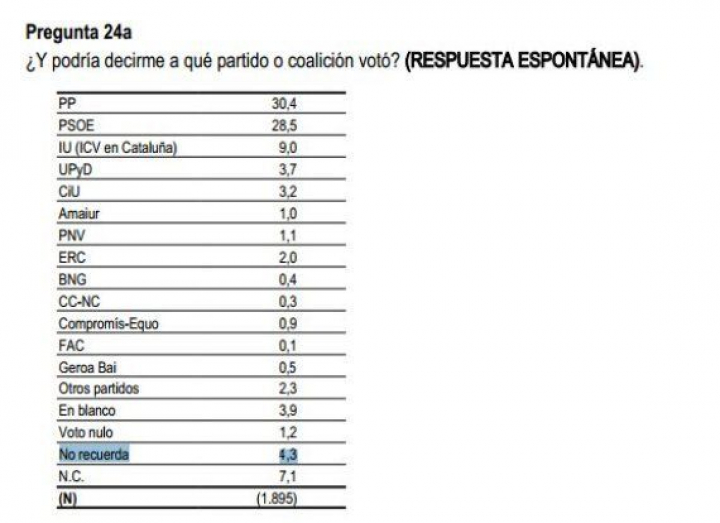 Y si algo no sale bien hagamos como si nunca hubiera pasado... El 4,3% de los encuestados (81 personas) no recuerdan por qué partido votaron en las elecciones de 2011.