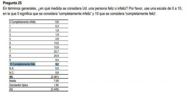 El paro, la corrupción y la economía siguen siendo los principales problemas de los españoles. Pese a todo, más del 9,2% de los entrevistados dice ser "completamente feliz", frente al 0,6% que se declara "completamente infeliz". En una escala de felicidad del 1 al 10 los mayores porcentajes se sitúan del 5 para arriba.