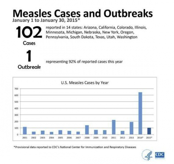 Todas estas declaraciones se unen a lo dicho el pasado viernes por Anne Schuchat, directora del Centro Nacional de Inmunización y Enfermedades Respiratorias de EEUU: "El sarampión es tan contagioso que si una persona está infectada, el 90% de los no inmunizados que están a su alrededor también se infectarán".