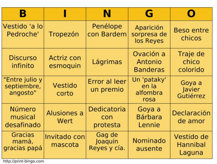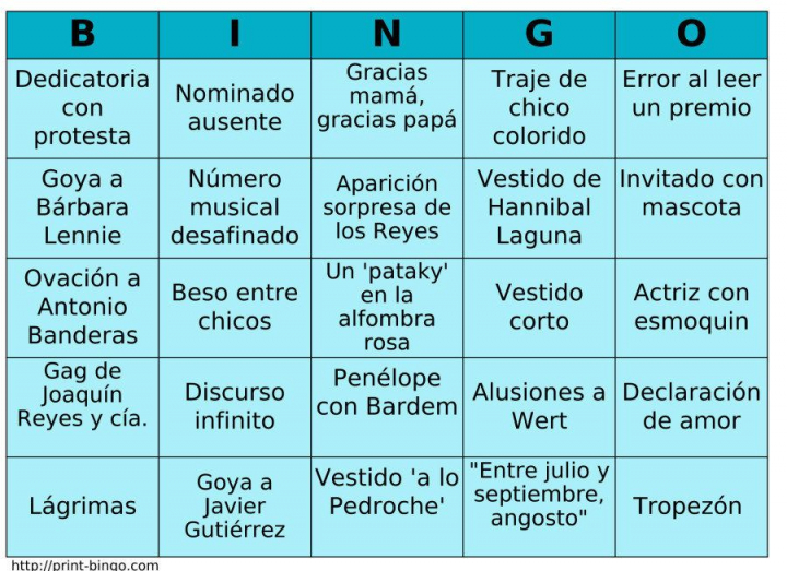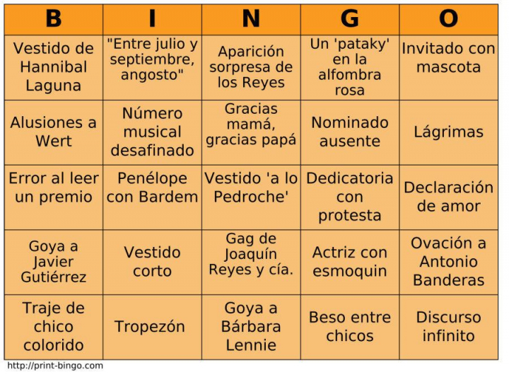 En este clásico bingo cinéfilo te ofrecemos una serie de situaciones más o menos fáciles que pueden pasar en los Goya. Hay algunas improbables (como que los Reyes vayan a la gala) y otras que apuntan maneras (unas lagrimillas, el típico agradecimiento a papá y mamá...). Ahí radica la gracia. Según vayan ocurriendo las cosas que indican las casillas, táchalas hasta que cantes ¡línea! o, por supuesto, ¡BINGO! El ganador podrá ganar desde un pequeño bote que se haya decidido previamente... hasta una noche libre de recoger y lavar los platos. Cualquier opción es buena. Solo tienes que imprimir los virtuales cartones (hay cuatro modelos distintos) y ¡a jugar!