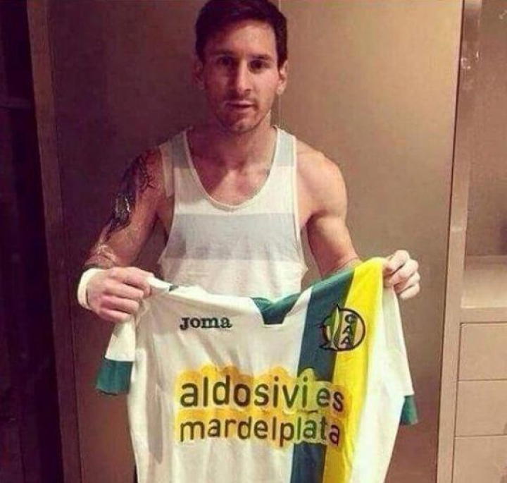 El astro argentino del Barça se ha fotografiado posando con la camiseta del Aldosivi argentino y, además, ha dejado ver su nuevo tatuaje, situado entre su hombro y su brazo derecho.
