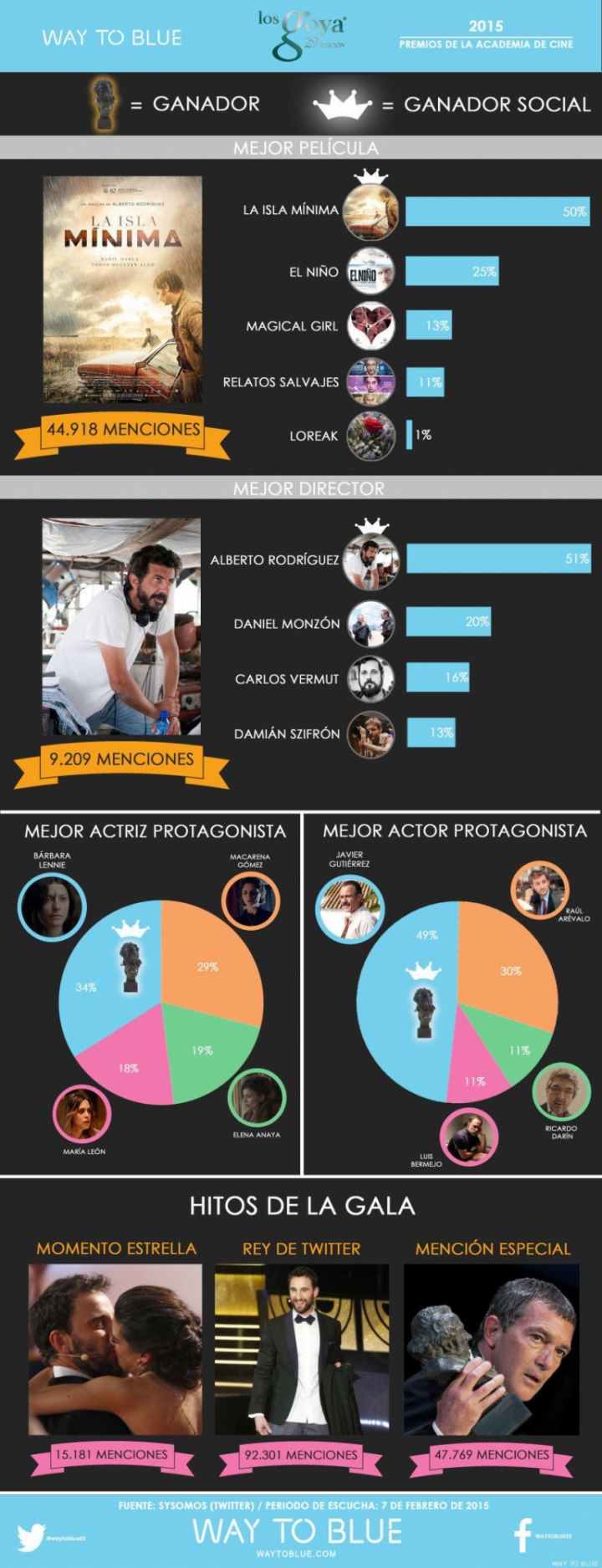 Los agencia de comunicación WayToBlue ha preparado una infografía con los resultados que hubiese tenido la gala si los tuiteros se hubiesen encargado de repartir los premios. La película protagonizada por Javier Gutiérrez y Raúl Arévalo hubiese arrasado, como también hubiese ocurrido si los académicos fuesen los lectores de El Huffington Post. Un 50,4% votaron a La isla mínima en la encuesta publicada el sábado antes de la ceremonia.
