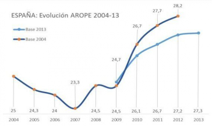 También se ha producido otro cambio estadístico en el modo en que el INE recoge los datos. Si en 2013 se aplicase el criterio que regía desde 2004, el indicador Arope sería un punto mayor, es decir, un 28,4 por ciento de la población en riesgo de pobreza y exclusión frente al 27,3 que reflejan los datos tras la modificación.