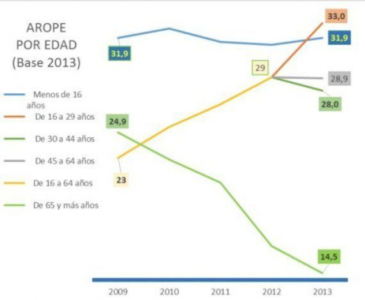 La situación varía en función de los perfiles. Al cierre de 2013 el colectivo más afectado era el de jóvenes entre 16 y 30, con un 33% en riesgo de pobreza y exclusión, seguido de los niños, con un 31,9 por ciento. En total, la tasa de pobreza infantil para menores de 16 años es del 26,7%, seis puntos por encima del conjunto de la población.