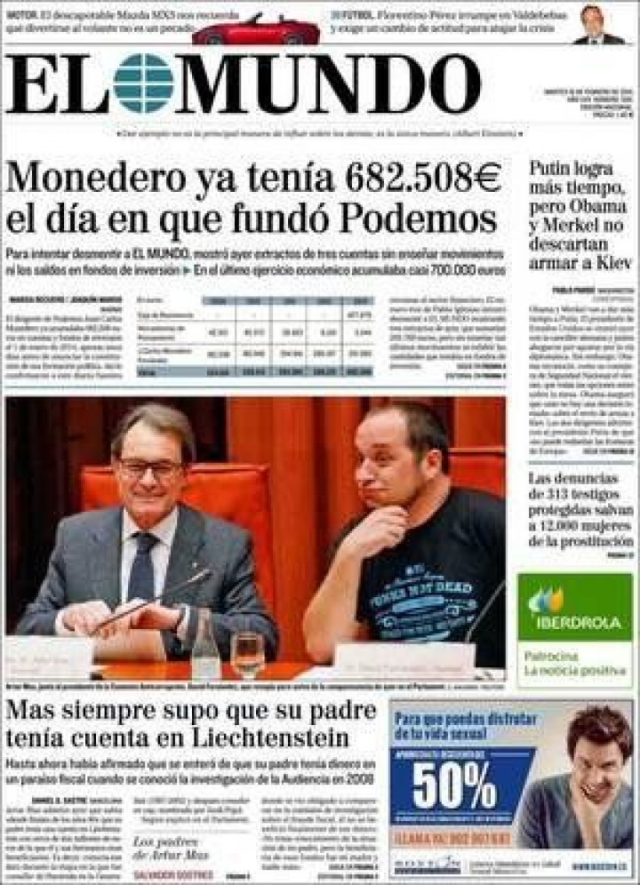 "Monedero ya tenía 682.508 euros el día que fundó Podemos", titula a toda página El Mundo, que denuncia lo que considera un intento de desmentido por parte de Monedero al mostrar extractos de tres cuentas "sin enseñar movimientos ni los saldos en los fondos de inversión". En ABC se asegura que "PP, PSOE e Izquierda Unida exigen a Monedero que explique los pagos de Venezuela" y La Razón se descuelga con un sondeo exclusivo que concluye que "uno de cada cuatro simpatizantes de Podemos ya exige la dimisión de Monedero por sus escándalos". En un tono más reflexivo, David Trueba, en su columna de El País, escribe: "En España nos hemos acostumbrado a que el ministro Montoro sacuda con filtraciones de inspección de Hacienda a sus rivales, pero no dedique la misma medicina a escándalos que afectan a su partido, propiciando una confusión triste entre instituciones y Gobierno".