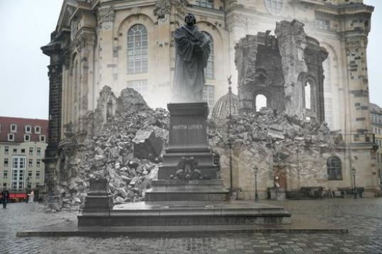 Composición que muestra la iglesia Frauenkirche en ruinas tras el pedestal vacío de la estatua de Martín Lutero en 1946 tras los bombardeos aliados. Tanto la estatua como la iglesia han sido reconstruidas.