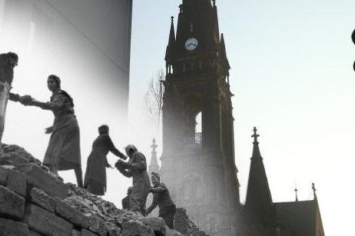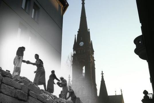 Una cadena de mujeres reconstruye la ciudad frente a la iglesia de Lutero en Neustadt, un distrito destrozado por el bombardeo aliado de 1945. Al fondo puede verse la torre a día de hoy.